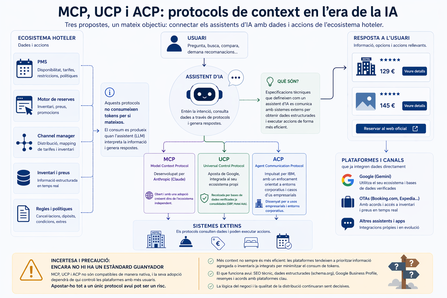 És important entendre que cap d’aquests protocols consumeix tokens per si mateix, tot i que sí els genera de forma indirecta quan un model d’IA interactua amb la informació que exposen. El consum de tokens es produeix quan l’assistent incorpora aquestes dades externes al seu context intern per raonar —el que compta com a tokens d’entrada— i quan genera respostes a partir d’elles —tokens de sortida—, un cost que augmenta com més extensos i detallats són els continguts (inventaris complets, regles tarifàries, polítiques, etc.) i que es multiplica en fluxos conversacionals amb trucades repetides. En canvi, ni l’estàndard tècnic, ni l’endpoint, ni l’intercanvi previ entre sistemes consumeixen tokens: un PMS pot respondre a MCP sense cost fins que un LLM interpreta aquesta informació. Aquesta distinció és especialment rellevant per al sector hoteler, perquè més context no implica necessàriament major eficiència: les plataformes que controlen l’accés a la IA tenen incentius clars a minimitzar el consum de tokens i, a la pràctica, tendeixen a prioritzar informació agregada o inventaris ja integrats a nivell de plataforma davant de protocols individuals de cada hotel.