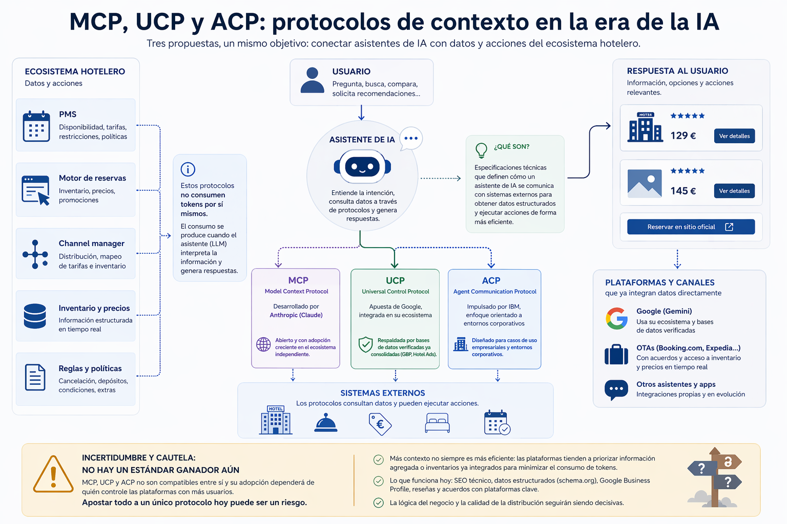 Es importante entender que ninguno de estos protocolos consume tokens por sí mismo, aunque sí los genera de forma indirecta cuando un modelo de IA interactúa con la información que exponen. El consumo de tokens se produce cuando el asistente incorpora esos datos externos a su contexto interno para razonar —lo que cuenta como tokens de entrada— y cuando genera respuestas a partir de ellos —tokens de salida—, un coste que aumenta cuanto más extensos y detallados son los contenidos (inventarios completos, reglas tarifarias, políticas, etc.) y que se multiplica en flujos conversacionales con llamadas repetidas. En cambio, ni el estándar técnico, ni el endpoint, ni el intercambio previo entre sistemas consumen tokens: un PMS puede responder a MCP sin coste hasta que un LLM interpreta esa información. Esta distinción es especialmente relevante para el sector hotelero, porque más contexto no implica necesariamente mayor eficiencia: las plataformas que controlan el acceso a la IA tienen incentivos claros a minimizar el consumo de tokens y, en la práctica, tienden a priorizar información agregada o inventarios ya integrados a nivel plataforma frente a protocolos individuales de cada hotel.